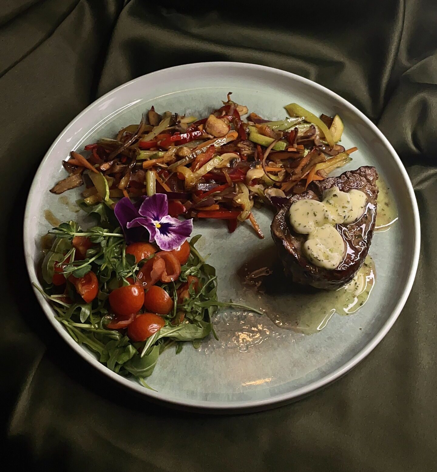 Biftek sa Krojter Puterom 2,150.00din. Juneći biftek, začinjeni puter, grilovano žilijen povrće, rukola, cherry paradajz