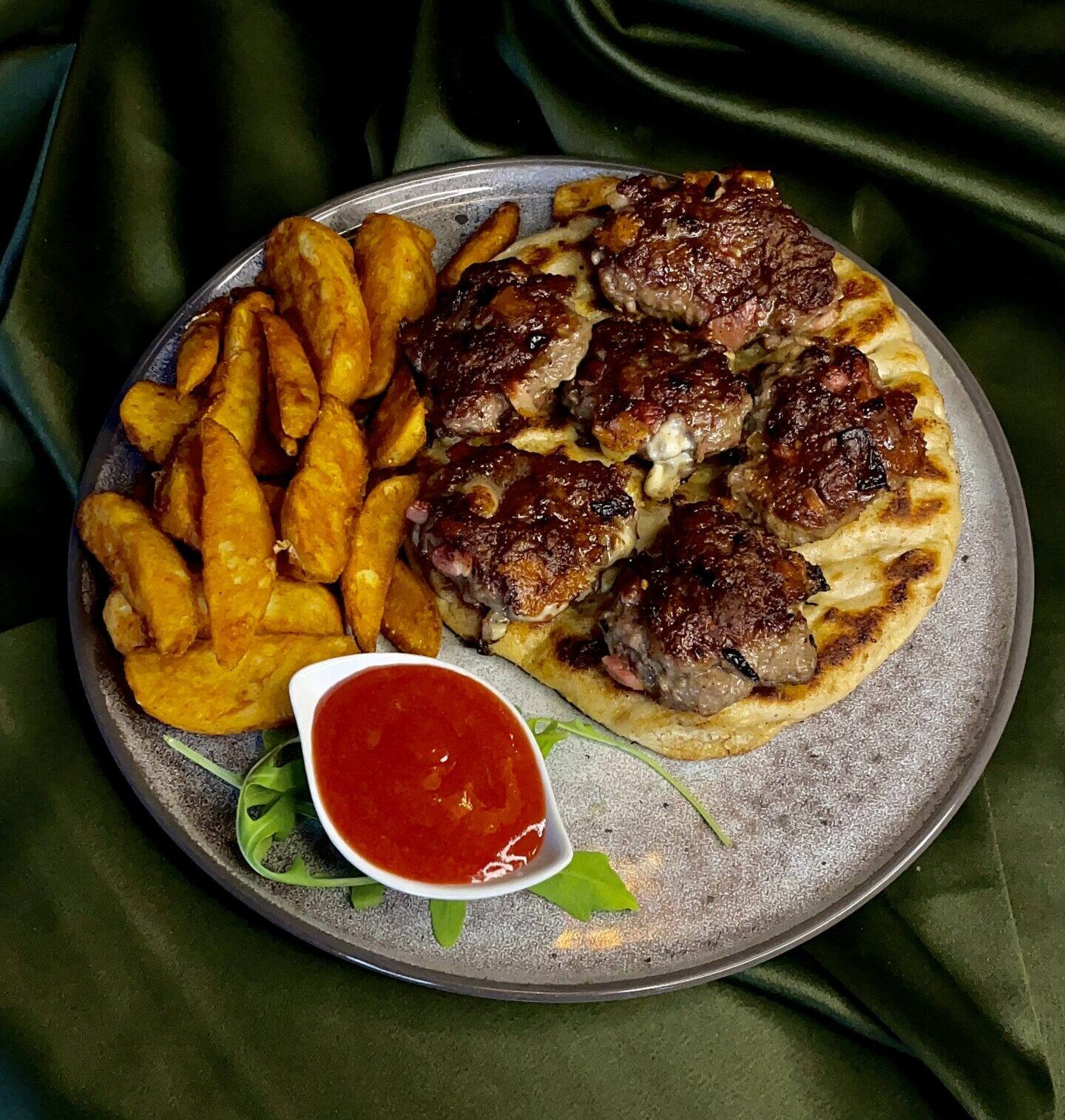 Gurmanski Uštipci 960.00din. 100% junetina, pančeta, kačkavalj, crveni luk, tucana paprika, aromatični krompir, kečap
