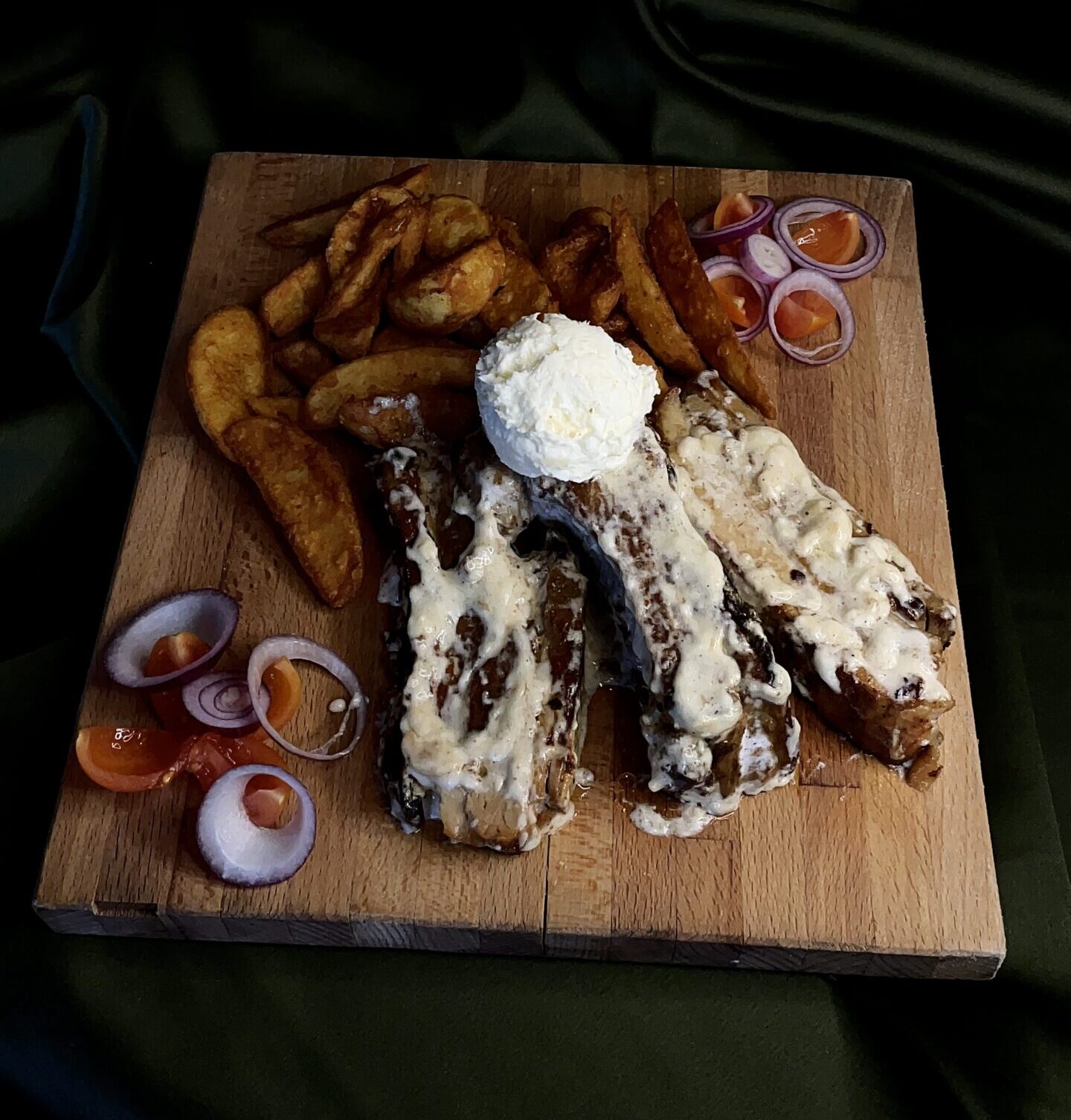 Marinirana Svinjska Rebra u Kajmaku 1,180.00din. Svinjska rebra, kajmak, kukuruz, koleslav salata, pekarski krompir