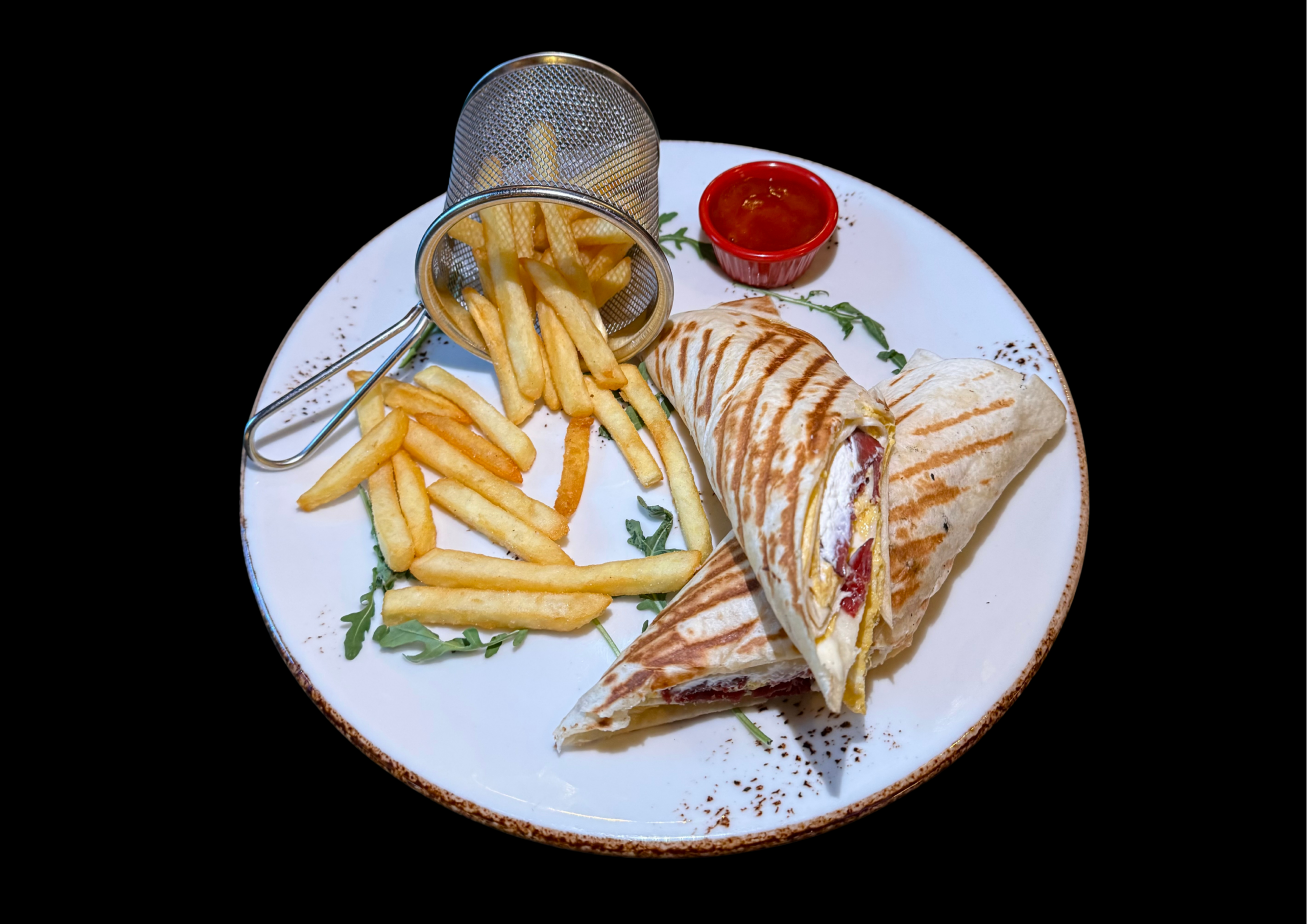 3 jaja, goveđa pršuta, feta sir, pomfrit, kečap