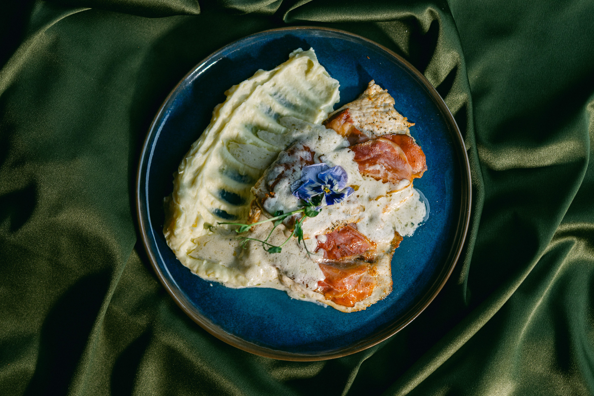 Piletina Saltimbocca 950.00din. Pileći file, njeguški pršut, žalfija, sos od putera i belog vina, pire krompir