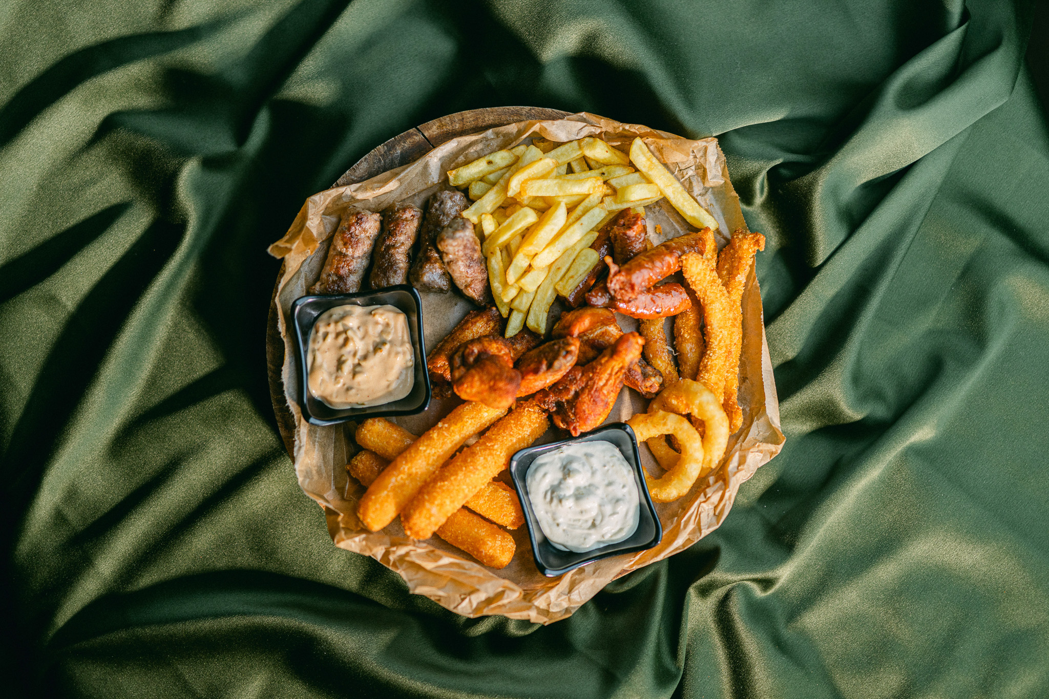 Pileća krilca, kobasica, ćevapi, pileći štapici, taquitos, pohovana mocarela, pohovani luk, burger sos, tartar sos, pomfrit