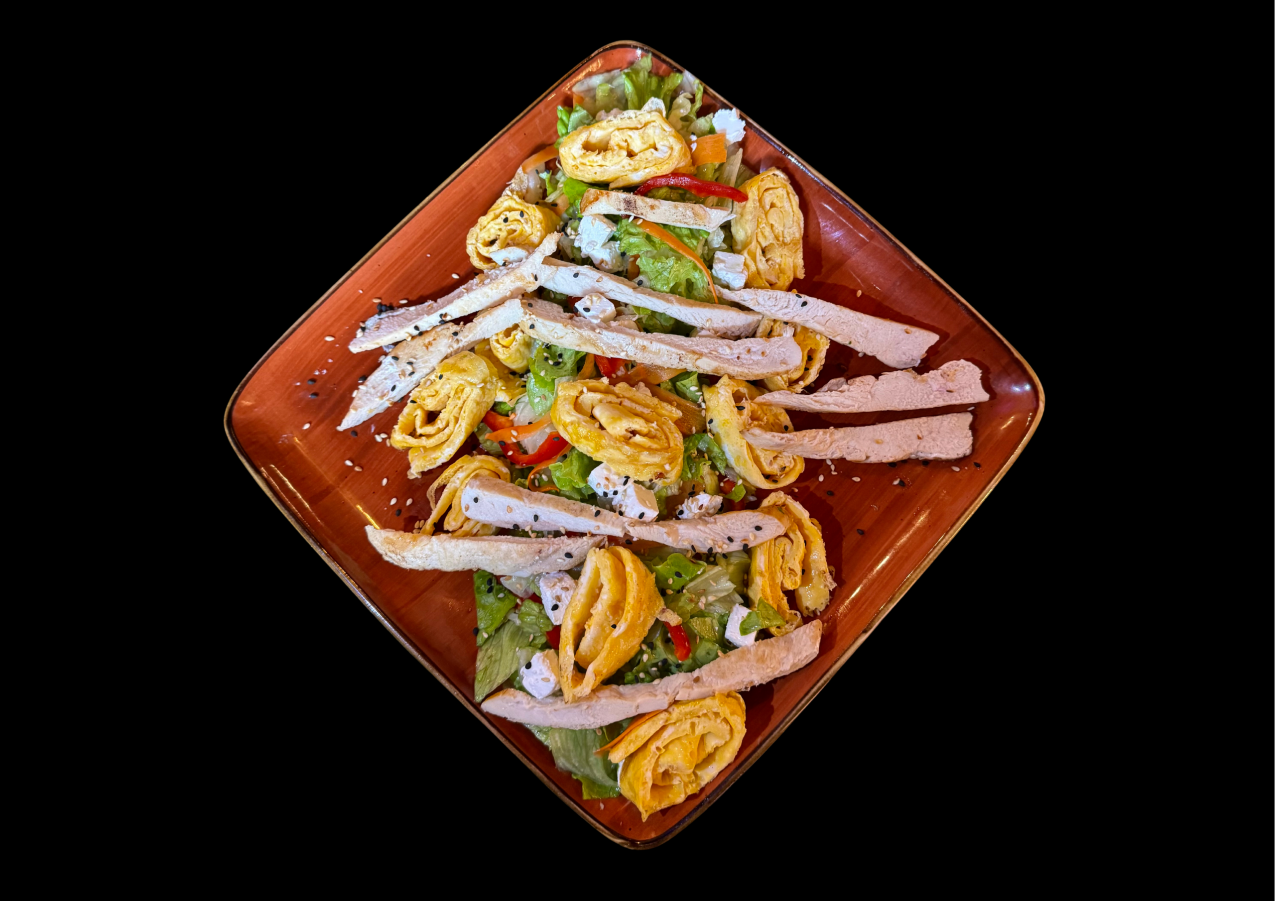 Omlet od 3 jaja, pileći file, mix zelenih salata, šargarepa, paprika, feta, susam