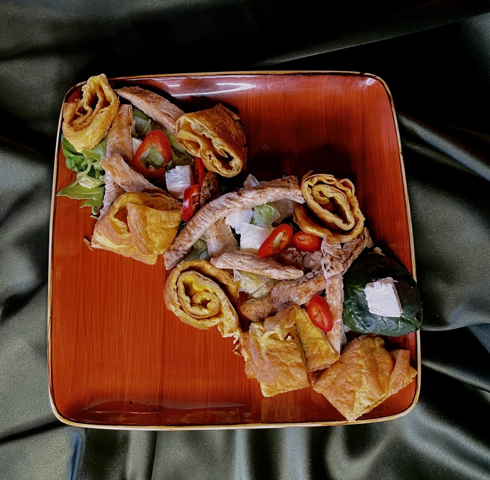 Proteinski doručak 490.00din. Omlet od 3 jaja, pileći file, mix zelenih salata, šargarepa, paprika, feta, susam